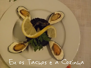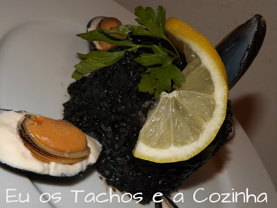 Um "arroz preto com lulas e mexilhões em maionese de alho". O arroz preto (também chamado Arròs negre em valenciano e catalão) é um prato de arroz seco feito numa frigideira ( paellaeira) ou numa panela de barro. A aparência e o sabor que diferenciá-lo de outros tipos de arroz é de ser feito com lulas ou chocos juntamente com a tinta natural proveniente tirada na altura de os limpar. A tinta é adicionada ao arroz no caldo de cozedura e é o que dá a cor a que se chama “ Arroz Negro”