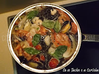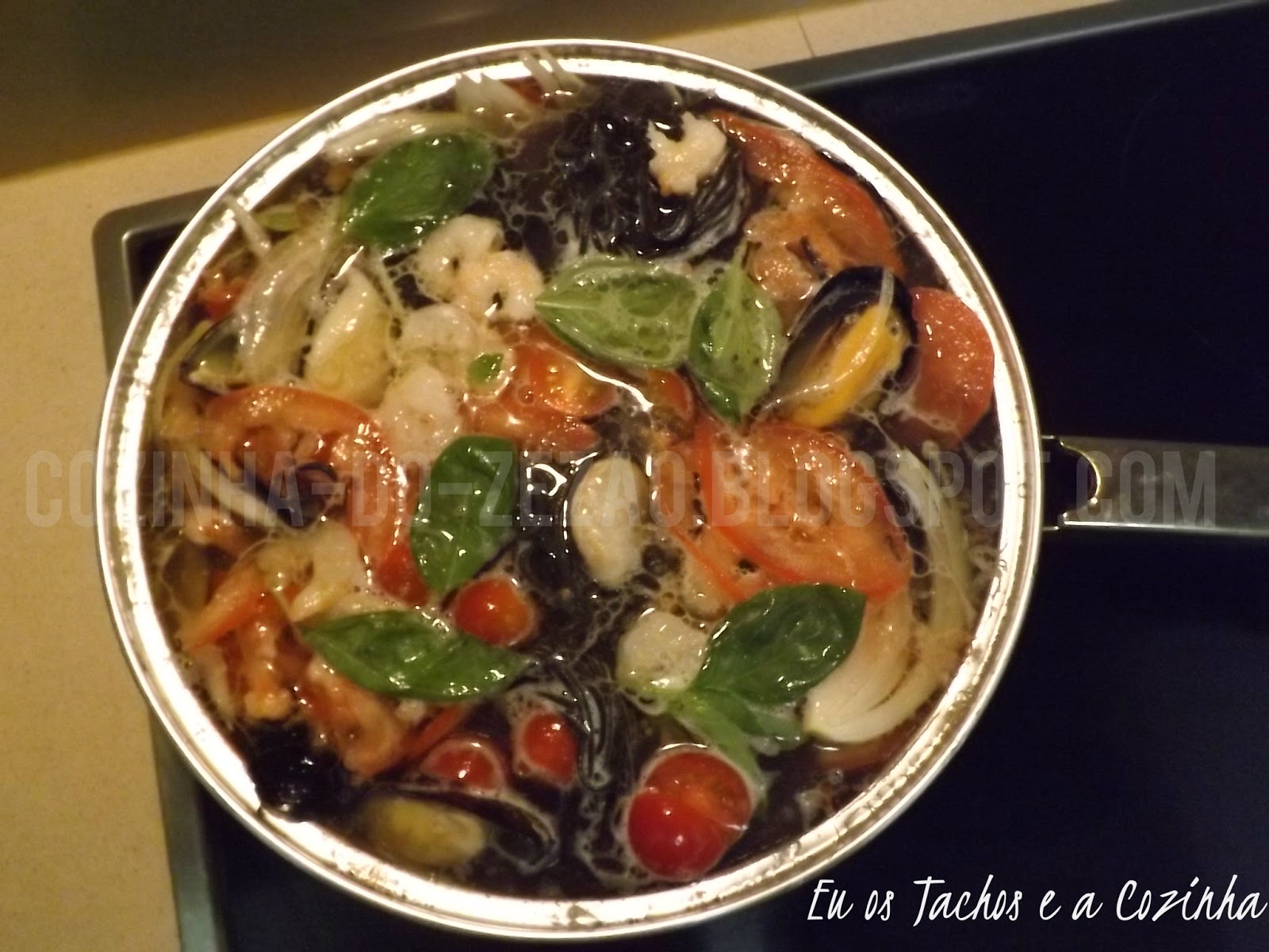 Num tacho largo ou uma frigideira em inox coloque a massa, junte os camarões, os mexilhões, os tomates cortado em rodelas bem finas (casso utilize tomate cherry basta corta-los ao meio), os dentes de alhos laminados e a cebola em Juliana bem finas.
