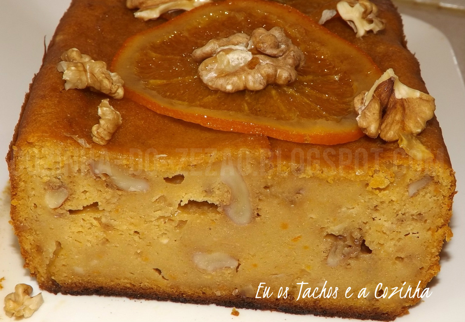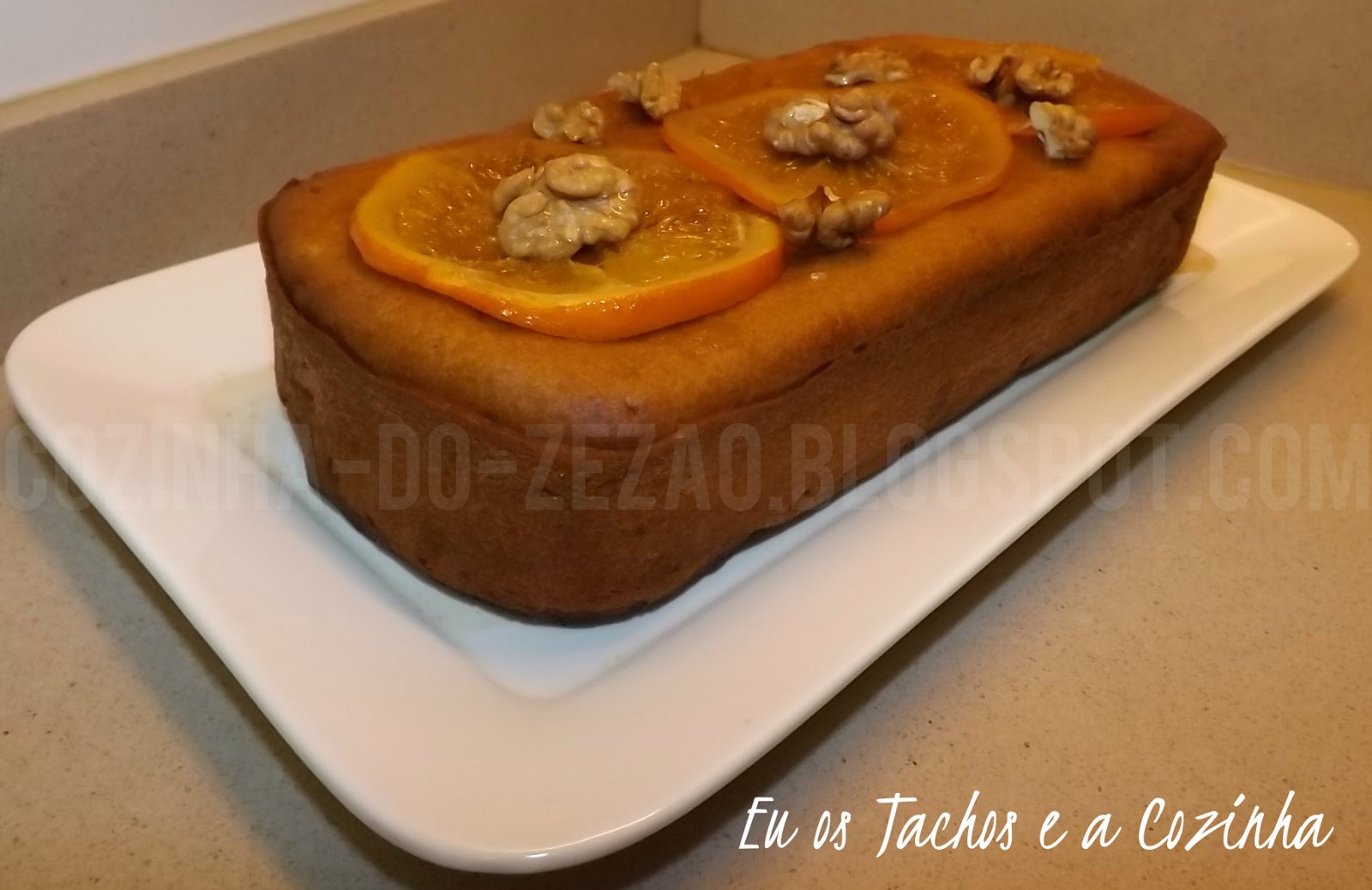 Verta o preparado numa forma retangular barrada com manteiga e polvilhada com farinha. Leve ao forno pré-aquecido a 180ªC cerca de 35 a 40 minutos. Desenforme em frio e enfeite com rodelas bem finas de laranja e algumas nozes, regue com mel e sirva em fatias.
