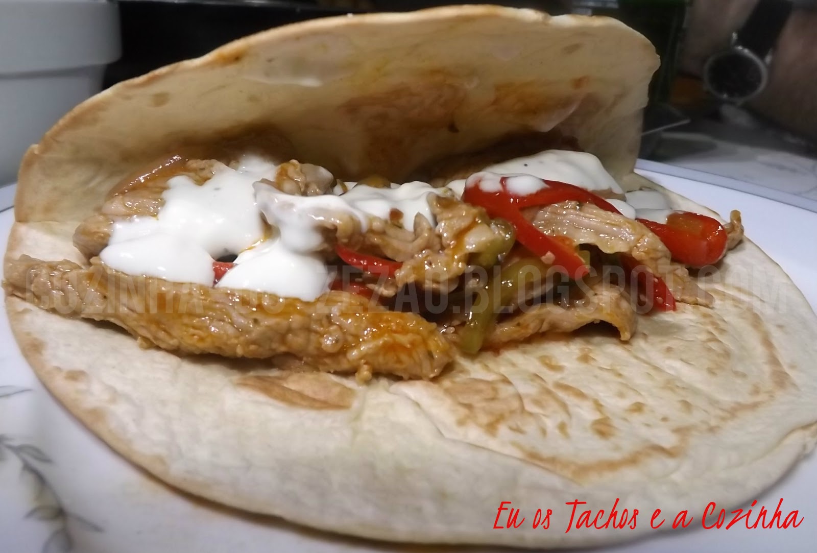 Descascar a chalota e cortar em tiras, cortar os bifes em tiras finas e limpar de sementes e cortar os pimentos em tiras, reserve. Num recipiente misturar o cominho, o colorau, a malagueta esmagada e tempera de sal e pimenta a gosto, misturara com as tiras de carne e deixar tomar gosto por uns 15 minutos. Aquecer um Wok grande com o azeite e saltear os pimentos com a chalota até que fiquem brando, agregar a carne marinada e cozer uns 3 minutos removendo e misturando sempre todos os ingredientes até que a carne esteja cozida, retire do lume e mantenha em lugar quente. Aqueça as tortilhas em uma sertã antiaderente e sirva recheada com o preparado de carne com o molho de iogurte, para dar um toque mais saudável acrescente um pouco de salada mista. Caso tenha crianças para que não fique tão picante substitua a malagueta por um ramo de coentros bem picado.